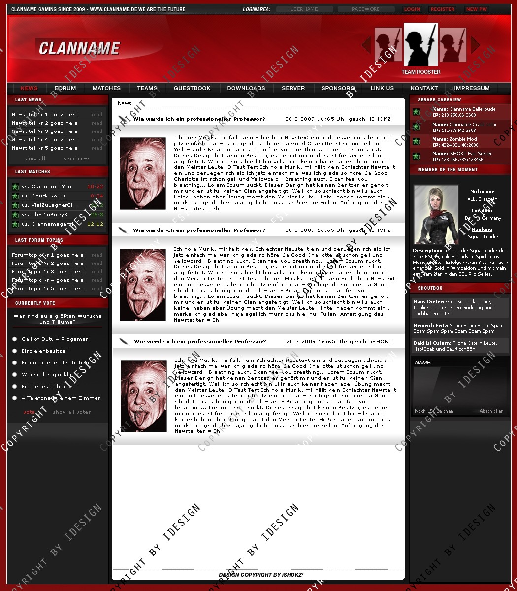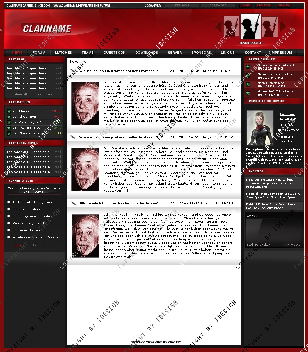 Dies ist ein professionelles Clandesign. Eine übersichtliche und geordnete psd Datei mit allen vorhandenen Ebenen ist vorhanden. Bei weiteren Fragen oder Support wenden sie sich per E-mail an "[email protected]" Dieses Design gibt es auch in Blau, schaut bei meinen Produkten.