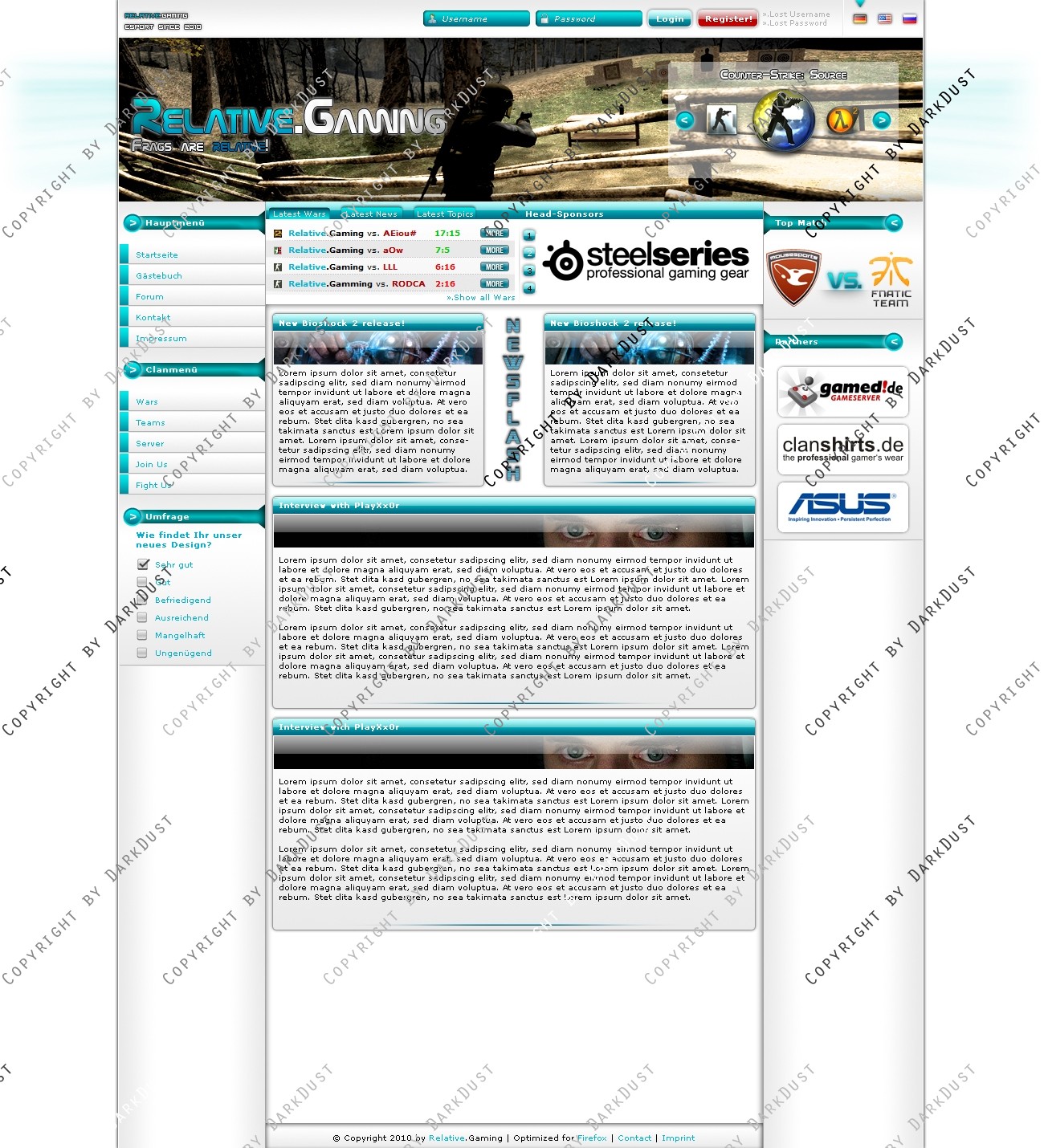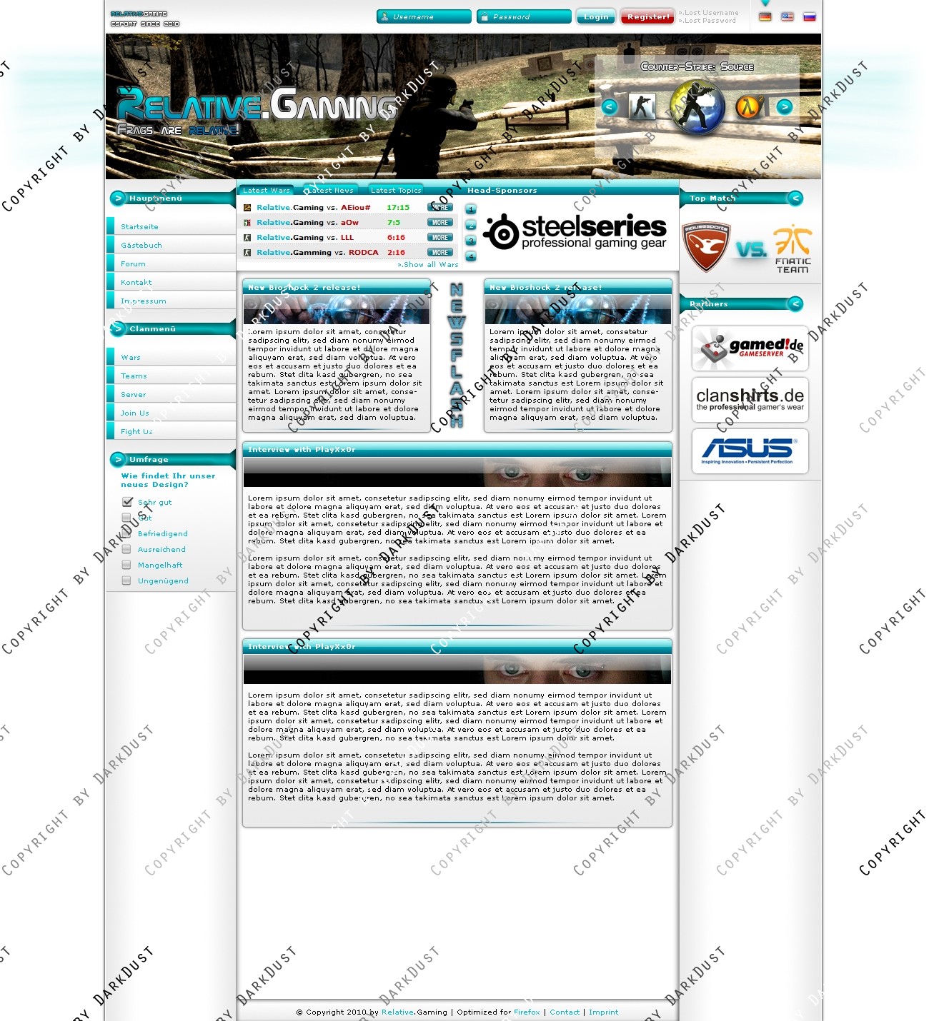 Hier verkaufe ich ein Clan-Design, welches ich in 10,2 Stunden Arbeit erstellt habe. Ich habe ein komplettes Konzept für dieses Design entworfen. Insgesamt soll die Seite sehr schlicht wirken, aber mit dem vielen Blau auch einen Hauch von Frische bekommen. Im Header befindet sich ein Game-Switcher, der auch mit einem Team-, oder Player-Switcher ersetzt werden kann. Alle Boxen im Layout sind natürlich auch in einer anderen Weise einsetzbar, als ich sie dargestellt habe. Insbesondere die Box im oberen Teil des Contents. Ich gebe ausdrücklich jedem Käufer die Möglichkeit, das Design auf eigene Wünsche weiter anzupassen! Für weitere Fragen stehe ich gerne zur Verfügung.