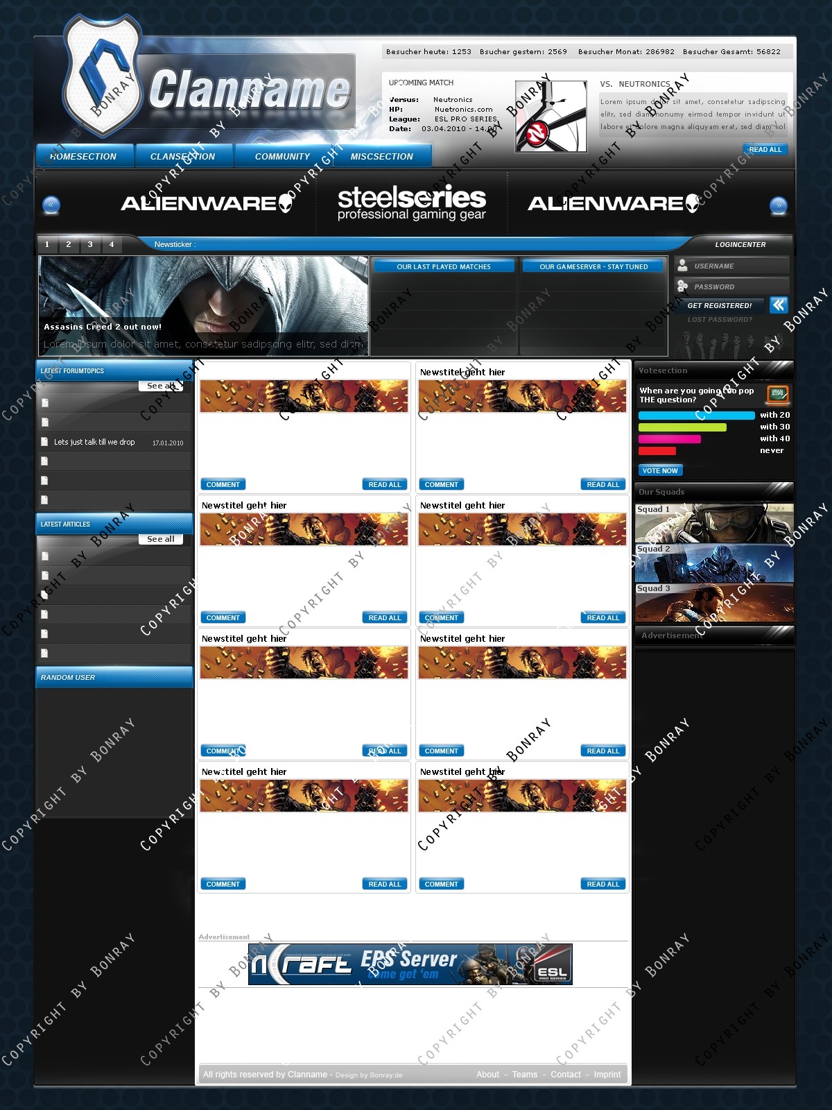 ich biete hier ein frisches, hochwertiges Clandesign in modernen Farben an. Das Design lässt sich einfach slicen und aufgrund des simplen Aufbaus leicht an gängige CMS Systeme wie Webspell und DZCP anpassen. Das Design lässt sich eigenhändig mit allen gängigen Photoshop Version bearbeiten.