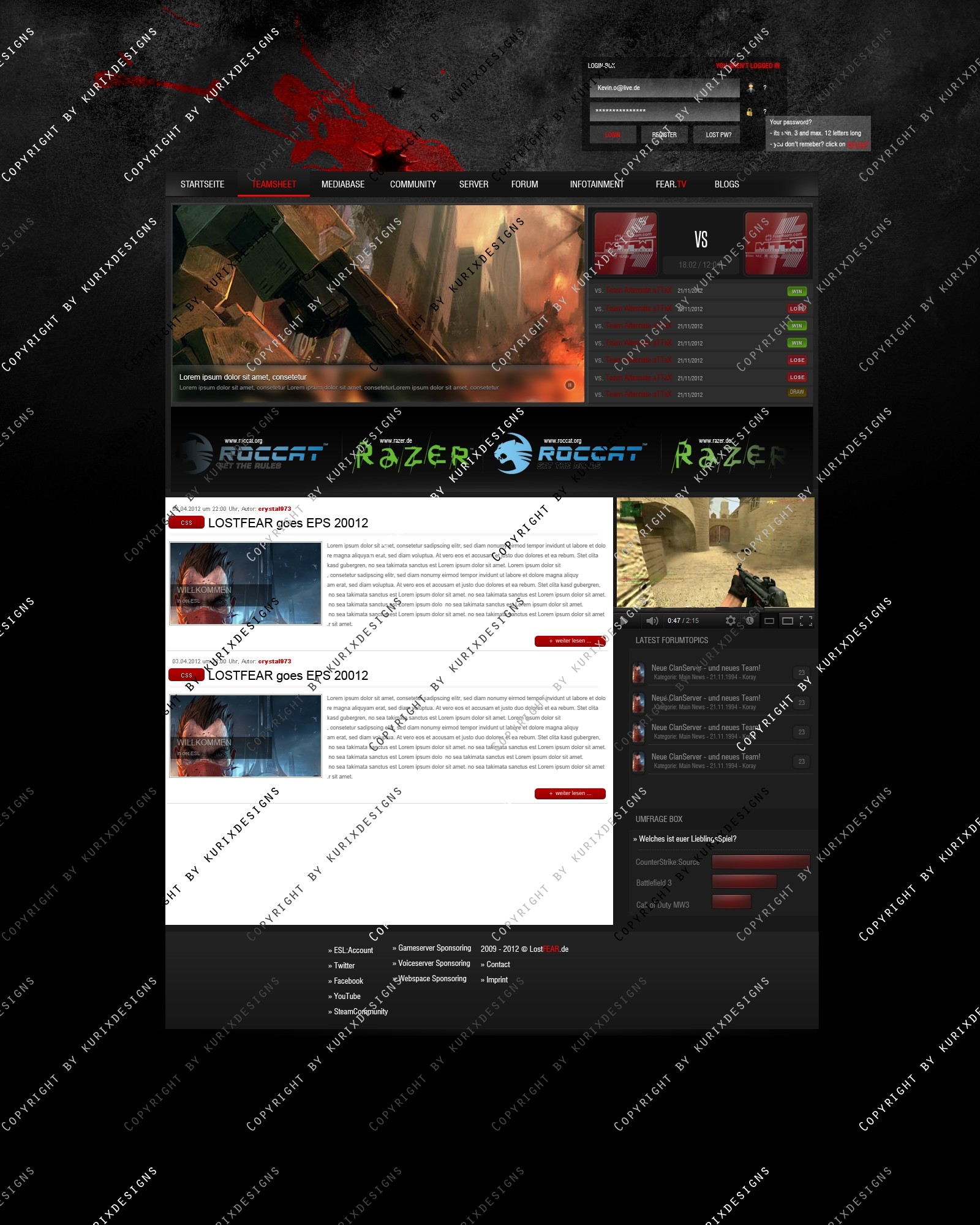 Dies ist ein eSports Design erstellt in Kooperation mit "Lost Fear" und soll für jeden Gaming Clan eine gute Webpräsenz bieten. Sowohl für neue Clans aber auch gestandene Clans ein gutes aber auch preiswertes Design...