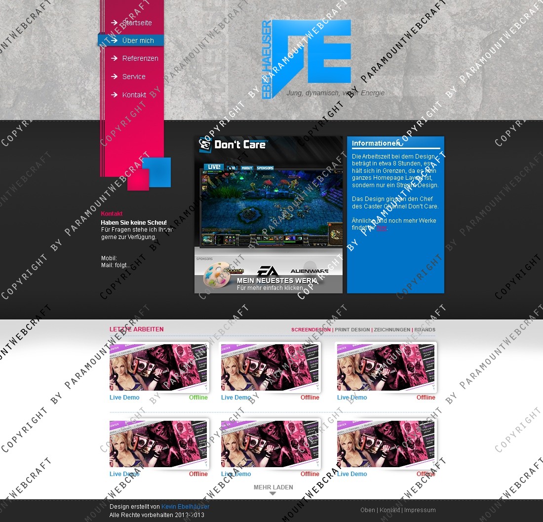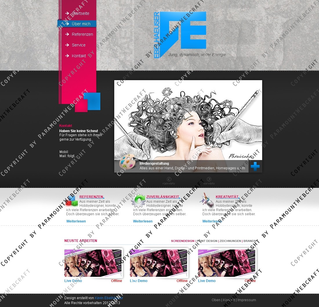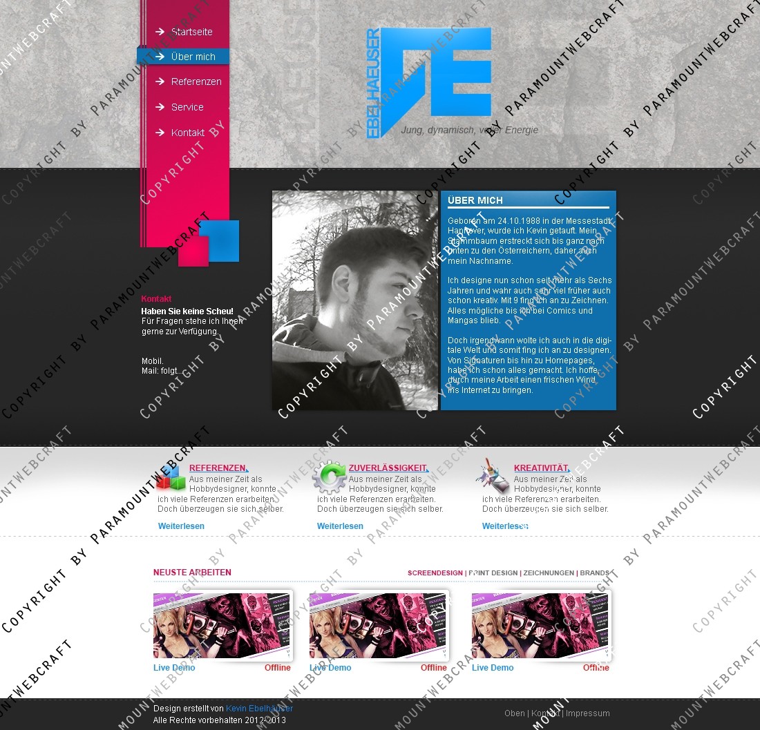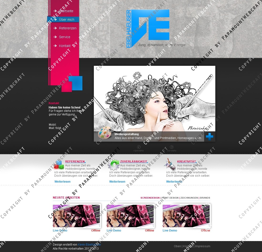 In diesem Packet erhalten Sie eine Photoshop Datei (.psd) mit einem Portfolio das vielseitig einsetzbar ist. Gedacht ist es für Mediengestalter aller Art die ein Portfolio zum Einstieg brauchen. Das Portfolio enthält auch Unterseiten wie z.B. Über Mich und Referenzen.