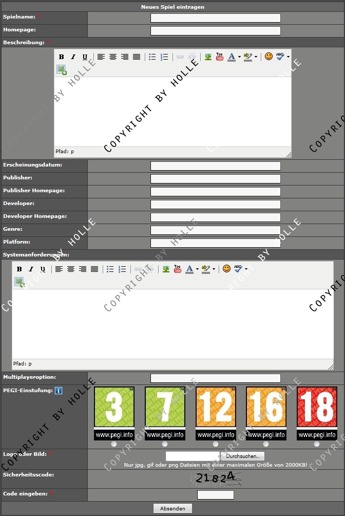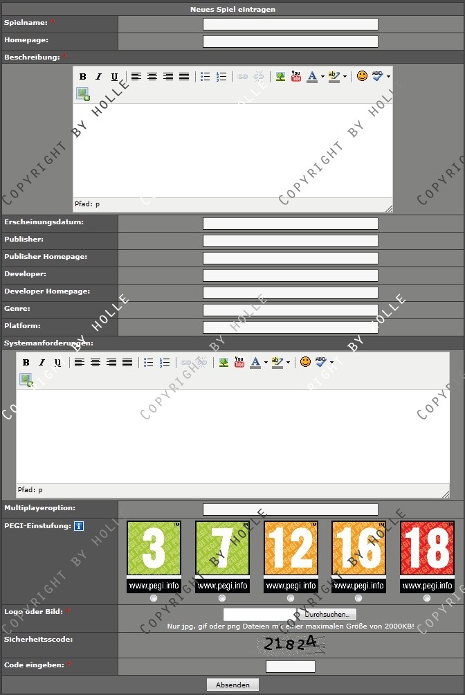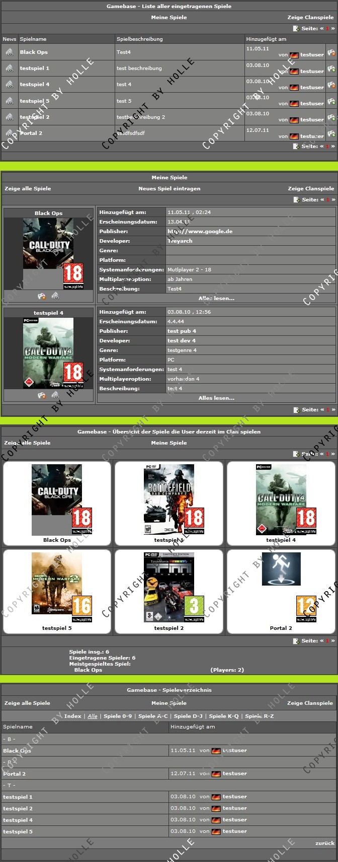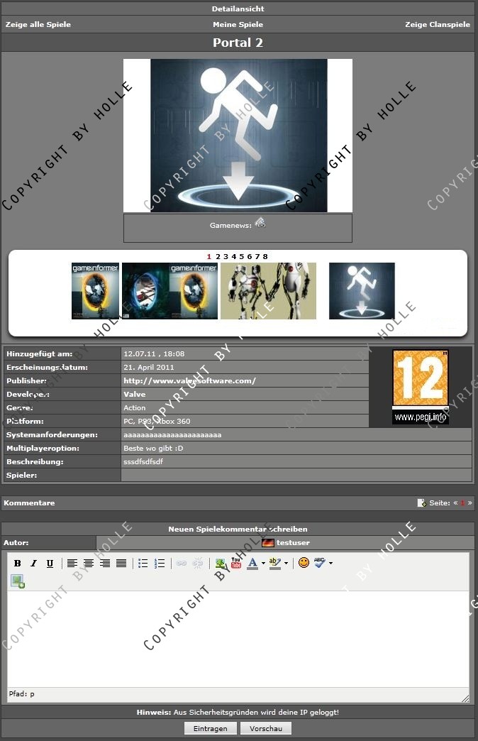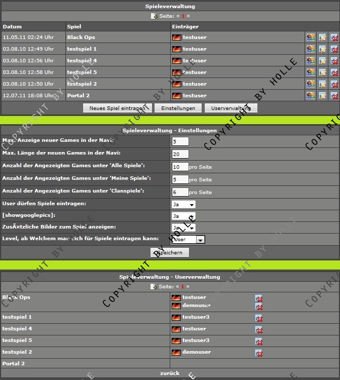 Angelehnt an das System der ESL habe ich hier eine Verwaltung für Spiele im Clan oder in der Community gecode, für die sich Member eintragen können. Zusätzlich können die Member im Clan eigene Spiele einreichen, indem sie ein Formular ausfüllen. (Dieses Feature kann aber vom Admin abgeschaltet werden)