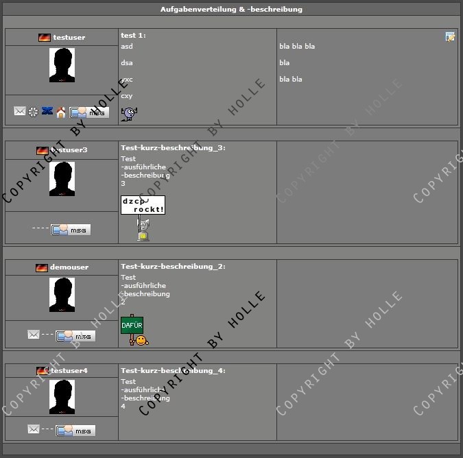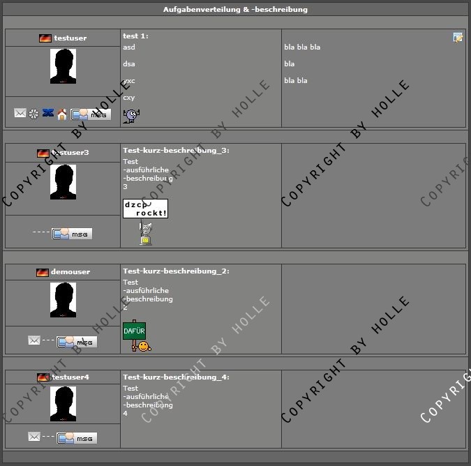 Nachdem mich meine Member mehrmals darauf angesprochen haben, wo & wie man denn einen Admin oder Zuständigen für einen bestimmten Bereich im Clan erreichen kann, bin ich auf die Idee gekommen, diese Übersicht dazu zu coden.