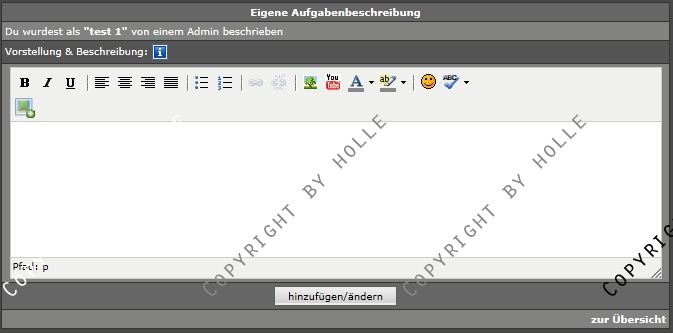 User, die in der Aufgabenverwaltung gelistet sind, können einen eigenen Text definieren und sich so zB Vorstellen oder eine eigene Stellenbeschreibung hinzufügen.