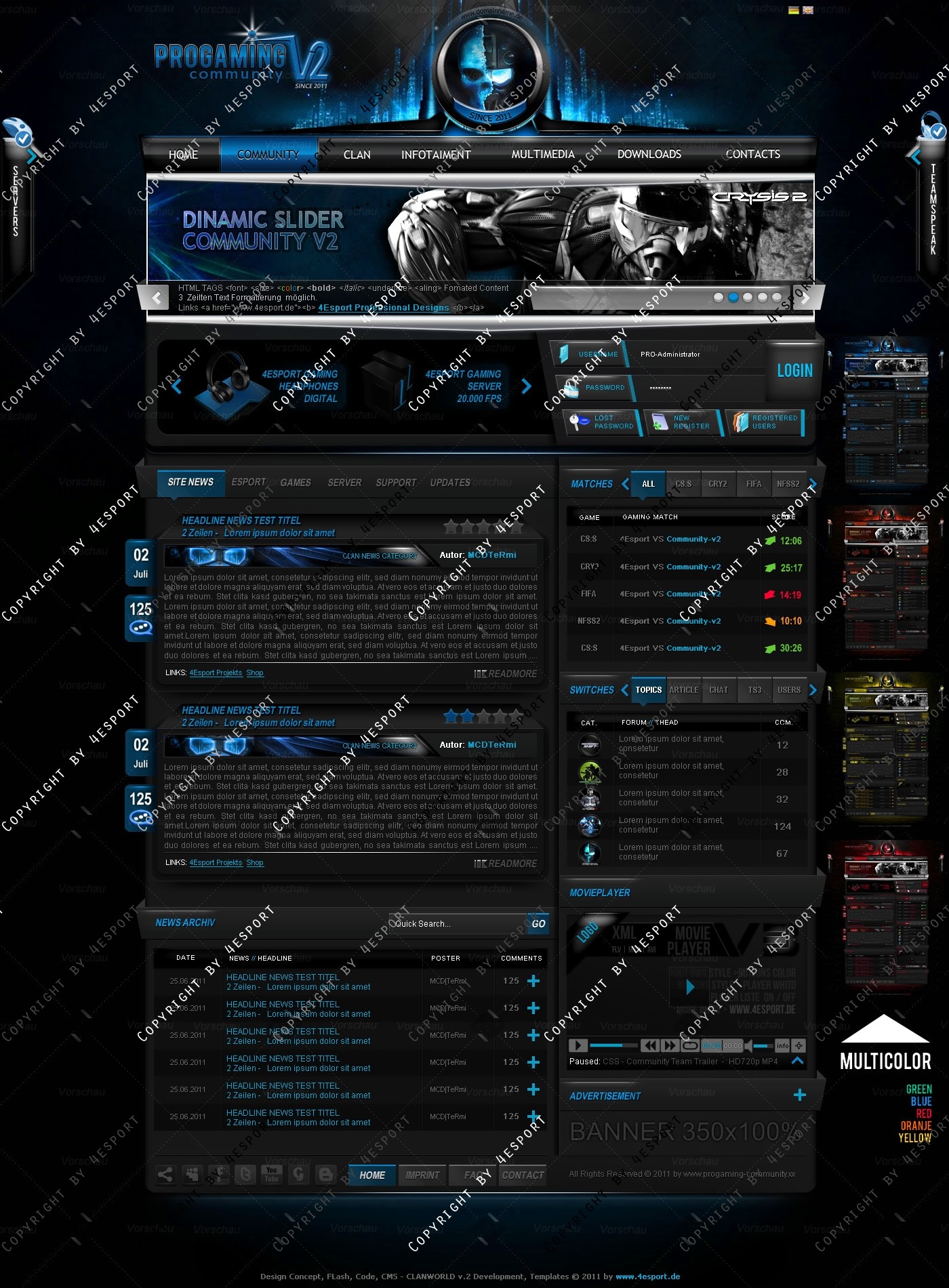 PROGaming Community V2 - Templates Premium Edition mit Flash Player 1 V3 Custom Edition und Featured System, CMS Erweiterung Webspell 4.2.2a, wird auf wünsch auf ClanWORLD v1.1 auch gecodet.