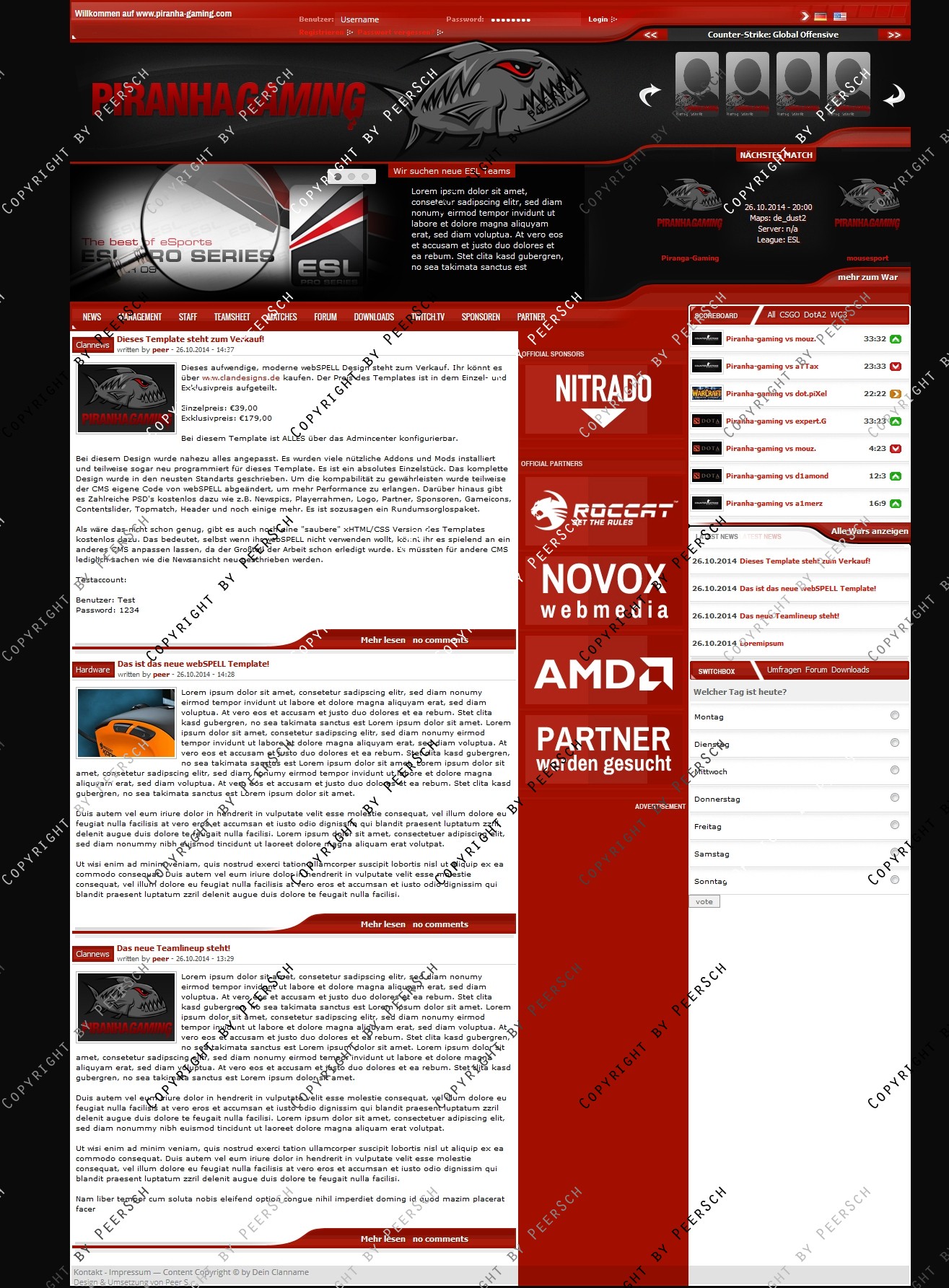 Kostenlos dazu gibt es noch folgende PSD's: Content Slider.psd, Gameicon.psd, Header.psd, Newspic.psd, Partner und Sponsoren.psd, Piranha Logo.psd, Playerrahmen.psd, Squadbanner.psd und Topmatch.psd